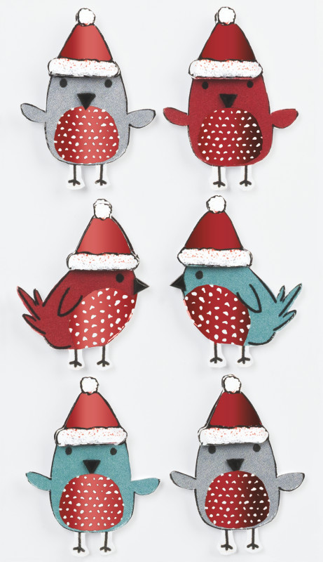 • Telpiskas dekoratīvas uzlīmes, putni ar Ziemassvētku cepurēm. Uzlīmēm ir dekoratīvi akrila kristāliņi un sarkans, spīdīgs folija pārklājums, uzlīmes aizmugurē ir līmviela. Lieliski piemērotas radošo darbu veikšanai, kā arī dekorāciju noformēšanai.